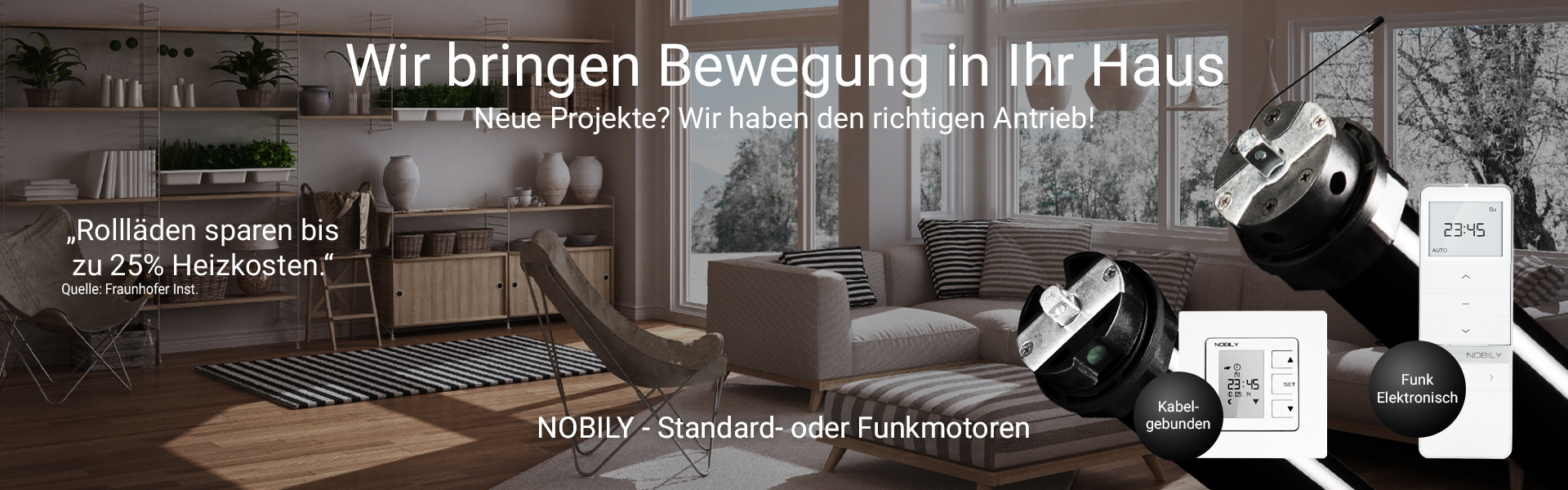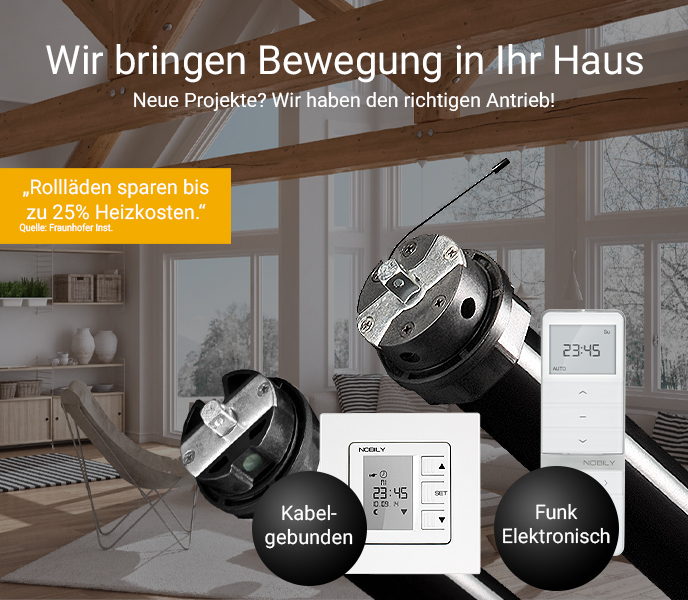 Sie sind auf der Suche nach mehr Komfort, Sicherheit und Lebensqualität im Alltag? Wir bieten Ihnen ideale Lösungen im Bereich Standard Mechanischer Rollladenmotore, Standard Elektronische Rollladenmotore, Funk Rollladenmotore oder Funk Elektronische Rollladenmotore, SmartHome, Haustechnik, Sichtschutz, Sonnenschutz. Wir bieten Profi-Fachhandelsware zum fairen Preis. Vom Rollladenantrieb, der Rollladensteuerung, über den Rollladenpanzer, bis zum Zubehör. Sie bekommen bei uns alles aus einer Hand. Ob Kabelgebunden oder per Funk gesteuert, selbst die Einbindung in ein SmartHome-System ist mit unseren Produkten kein Problem. Neben unseren Hauseigenen NOBILY Motoren bieten wir Ihnen auch diverse Markennamen in unserem Angebot an. Wir beraten Sie gern!