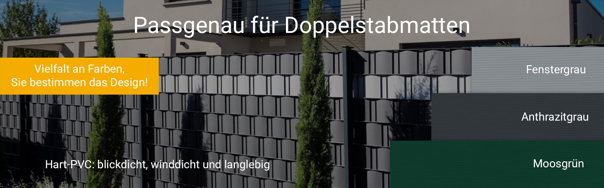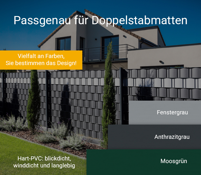 Unsere Premium Hart-PVC Zaun Sichtschutzstreifen in 5 verschiedenen Farben sind hervorragend geeignet, um jeden marktüblichen Doppelstabmattenzaun in einen attraktiven Sicht- und Windschutz zu verwandeln. Hergestellt aus hochwertigem Fensterkunststoff sind sie für einen dauerhaften Einsatz im Außenbereich ideal geeignet. Das Material ist extrem robust, witterungsbeständig, formstabil und vor allem über Jahre hinweg UV-stabil und lichtecht. Die leicht gerillte Oberfläche sorgt für eine ansprechende Optik. Das vorkonfektionierte Material ist mit einer Länge von 2,525 m bereits passend für alle handelsüblichen Zaunelemente zugeschnitten. Es lässt sich schnell, einfach und werkzeuglos montieren. Wir bieten die Zaun Sichtschutzstreifen in 5 verschiedenen Farbvarianten an, welche Sie nach eigenen Vorstellungen kreativ kombinieren und der Umgebung anpassen können.