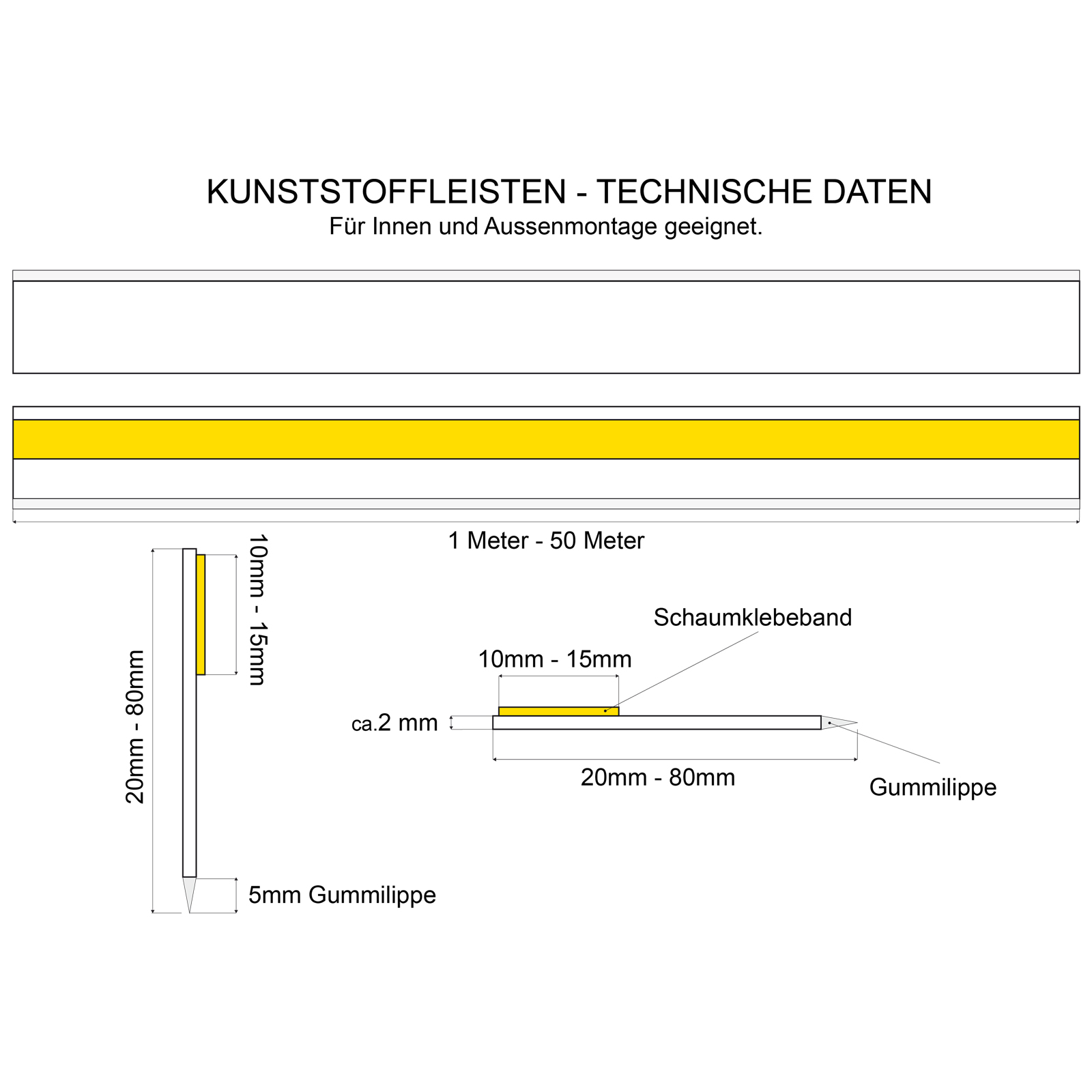 Wir bieten Ihnen eine Flachleiste auf Rolle ( 1,5 mm ) stark mit Schaumklebeband. Es handelt sich hierbei um eine selbstklebende, weiße Montageleiste aus PVC, welche sowohl für den AUSSEN- ALS AUCH FÜR DEN INNENBEREICH perfekt geeignet ist.
