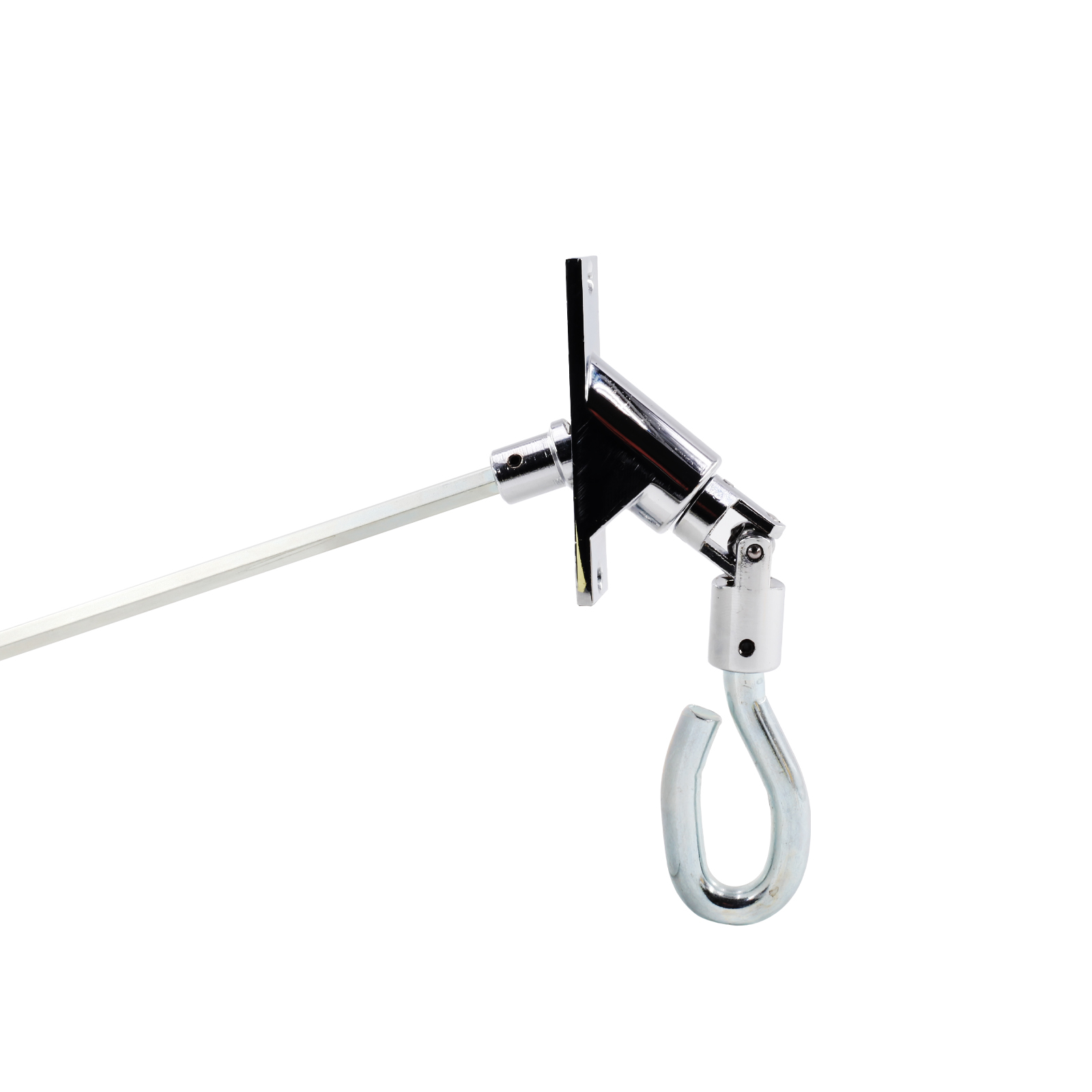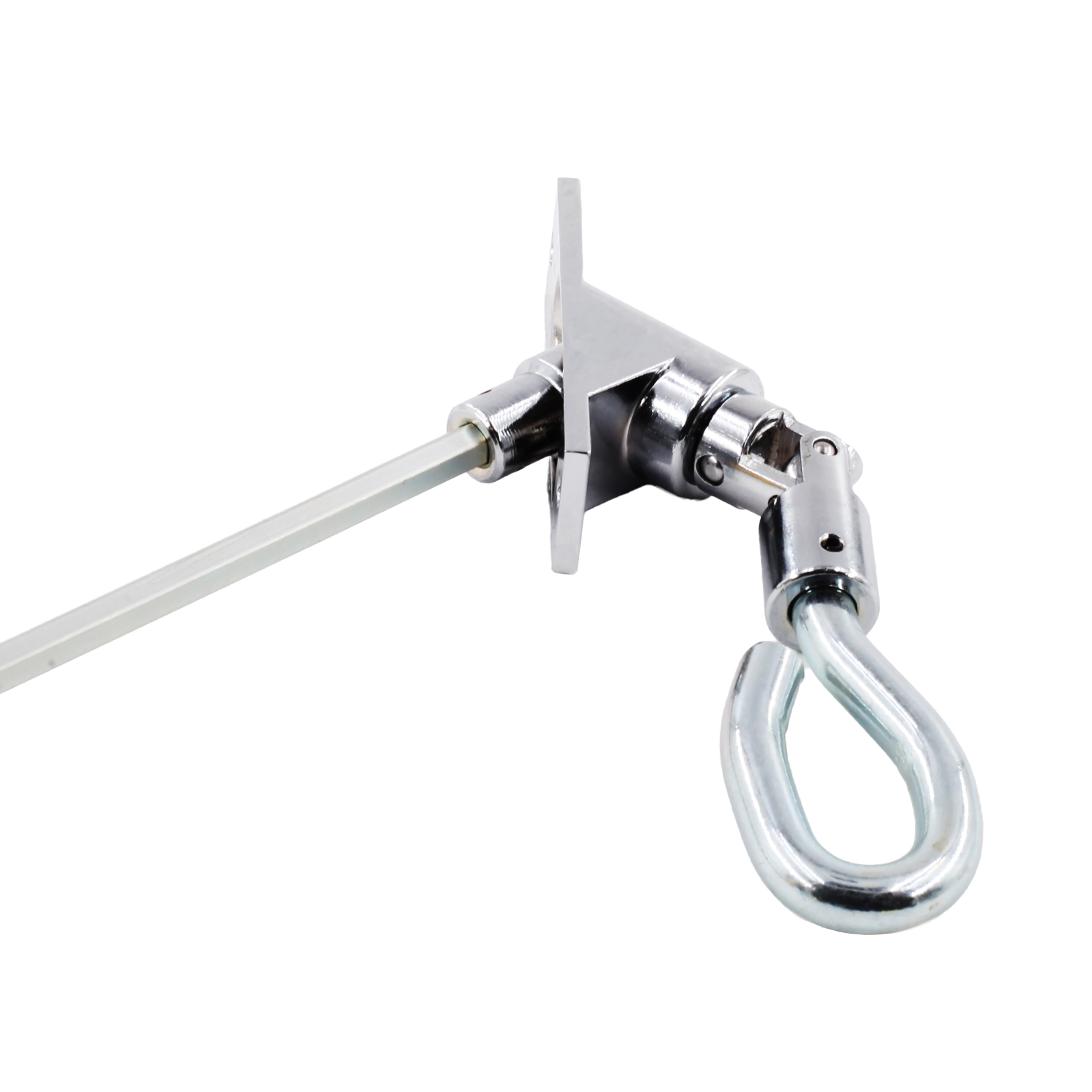 Gelenklager 90° mit Anschlussöse für abnehmbare Kurbel. Mit 340 mm Sechskantstab 7 mm. Das Gelenklager muss im 90° Winkel zum Stabanschluss montiert werden. Montageplatte mit 2 Befestigungslöcher, Lochabstand: 7,5 cm