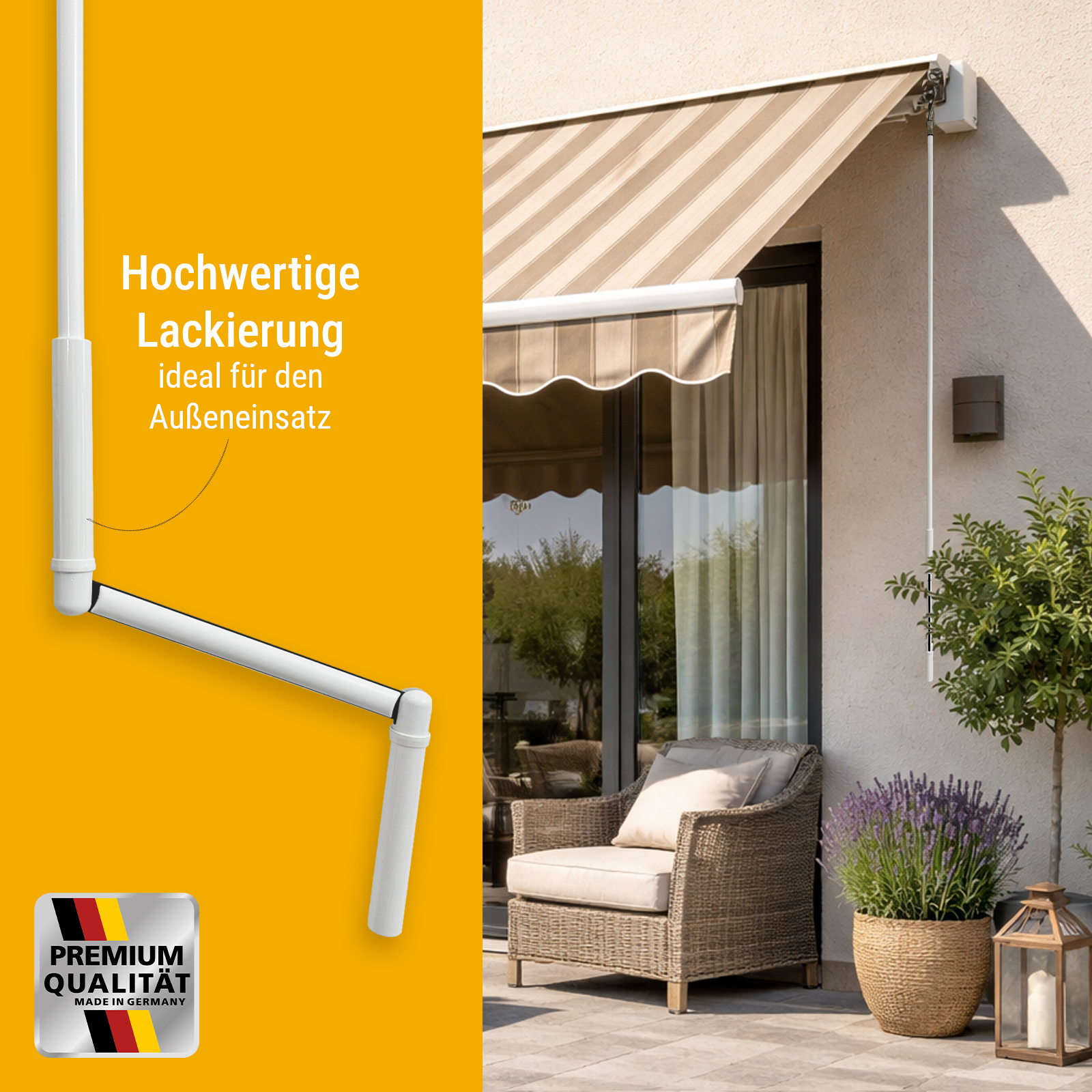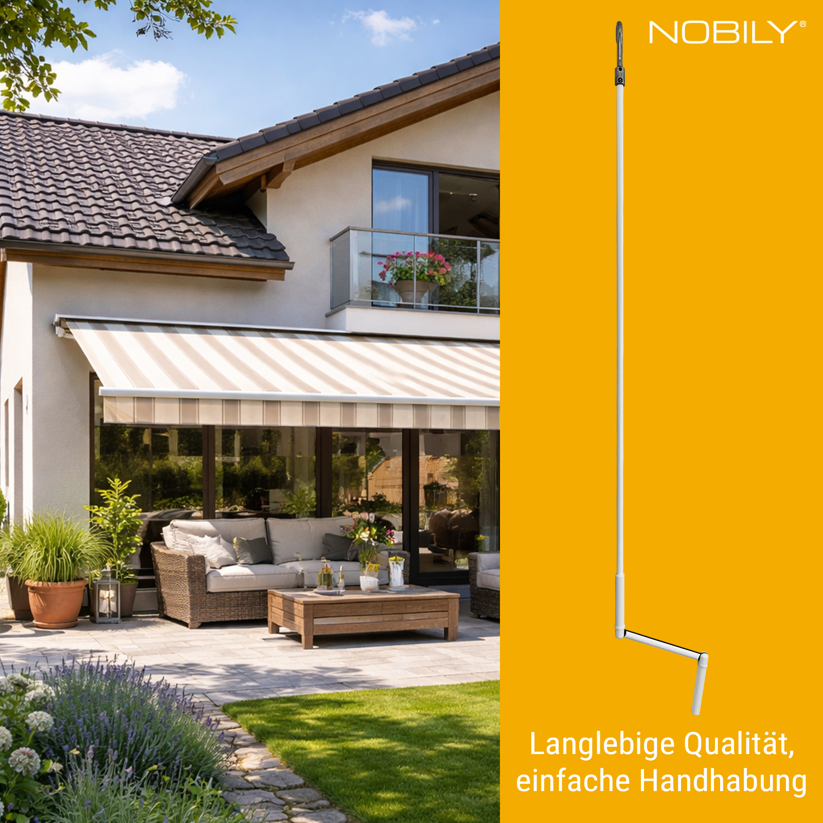 Der stabile Haken wird sicher am Markisenring eingehängt. Durch einfaches Drehen der Kurbel fährt die Markise gleichmäßig und kraftsparend ein oder aus.