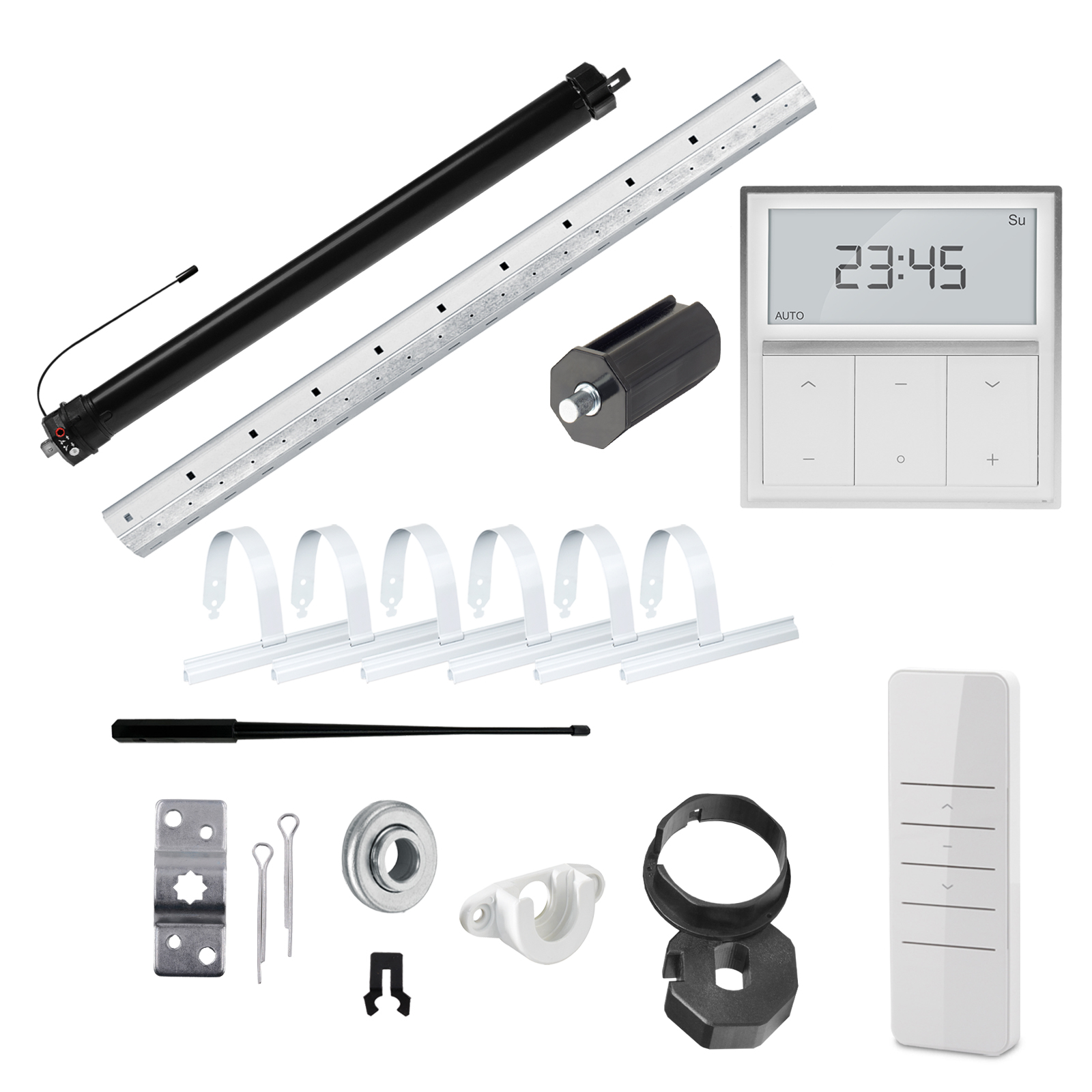 Produktinformationen "NOBILY Komplettset inkl. Funk-Rollladenmotor PR4, Rollladenwelle 200cm u. 1-Kanal Funk-Wandsender Timer Exquisit Zugkraft 13Nm / 36kg SW40"